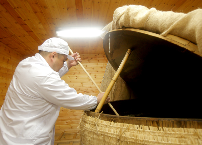 日本の伝統製法である時間と手間をかけて造る「古式静置発酵」。私共では、木桶で行う「静置発酵」により醪(もろみ)から、お酢を発酵します。